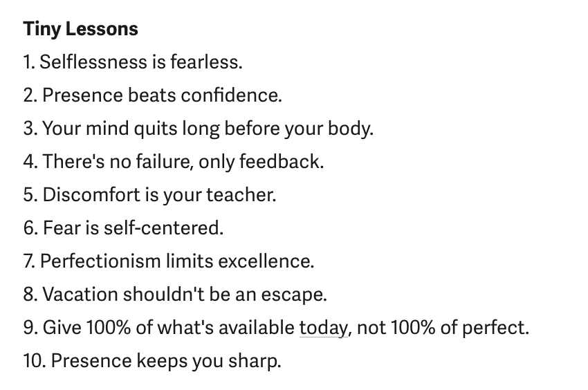 Inner Excellence Shane Parrish's Tiny Lessons hit like a gut punch. You'll see 10 below, and then 18 more on his podcast website from his interview with Jim Murphy, performance coach and Inner Excellence author. I skipped the podcast, for now, and downloaded the book immediately. You might think these lessons sound like well-worn self-help platitudes. But these felt different. They resonated. Maybe I needed to hear Murphy's message at this time. In any case, the book is excellent, at least so far. If anyone else has read it or wants to read it together, hit reply and let me know what you think.