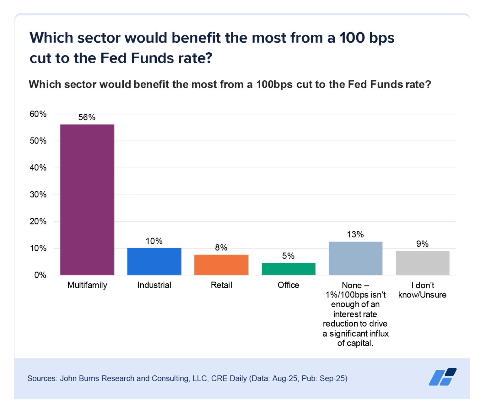 Recovery Optimism Building - While I learned long ago that hope is not a strategy, it's possible that rate cuts provide a much-needed tailwind to the multifamily sector. This survey from John Burns Consulting highlights multifamily as the CRE sector most likely to benefit from a decline in Fed Funds. Read more here: CRE Still Muted; Rate Cuts will Help Multifamilyβ