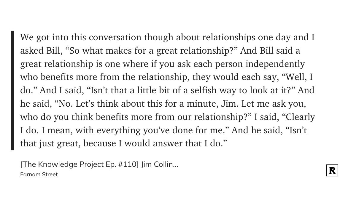 A Quote About Relationships I regularly revisit this story that Jim Collins shared in his conversation with Shane Parrish. This describes the beauty of a relationship in harmony; both feel they benefit more. In a transactional relationship, only one person would feel this way.