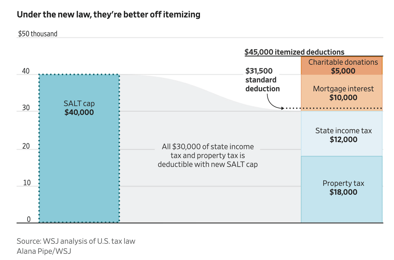 How to Squeeze the Most From the New SALT Cap Finally, a bit of good news for high-income earners in high-tax states like ME, MA, NY, and NJ. Not only will the higher State and Local Tax deductions help, but the change may also open opportunities for itemized deductions. This helpful article from the WSJ personal finance sections runs through the highlights, considerations, and tips. But, as always, seek professional advice.