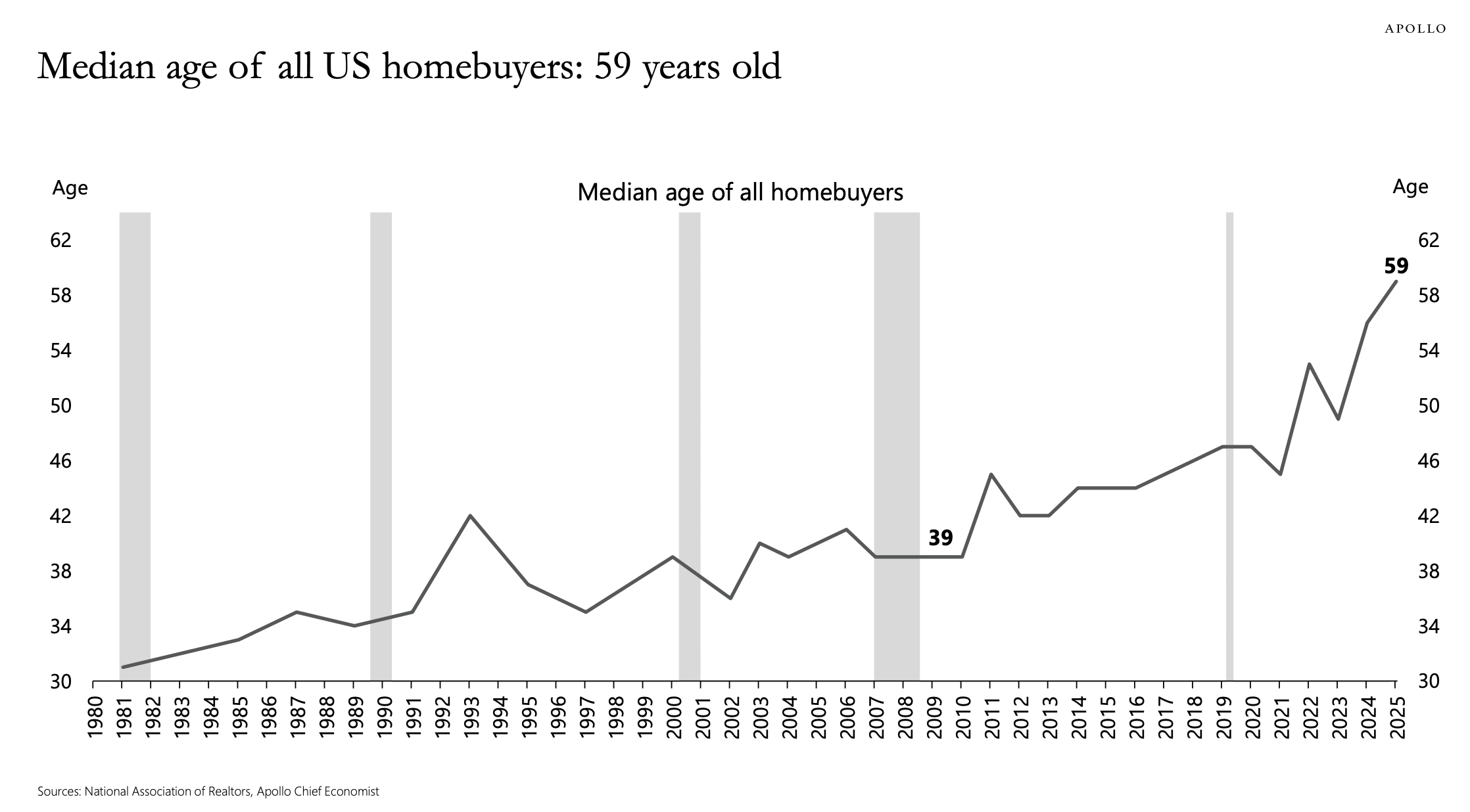 Ageing Homebuyer First-time and existing home buyers are getting older at an accelerating pace. The average age of first-time homebuyers is now above 40 years old, a record high. While correlation is not necessarily causation, it's not a big leap to assume affordability is the root cause here. Older buyers tend to have more money saved or home equity available as a down payment.